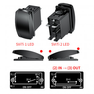 Spínač přepíná kladné napětí mezi kontakty 2 a 3. Na kontaktu 6 je napájení pro podsvícení nápisu a na kontaktech 7 a 8 je kostra pro podsvícení symbolu.