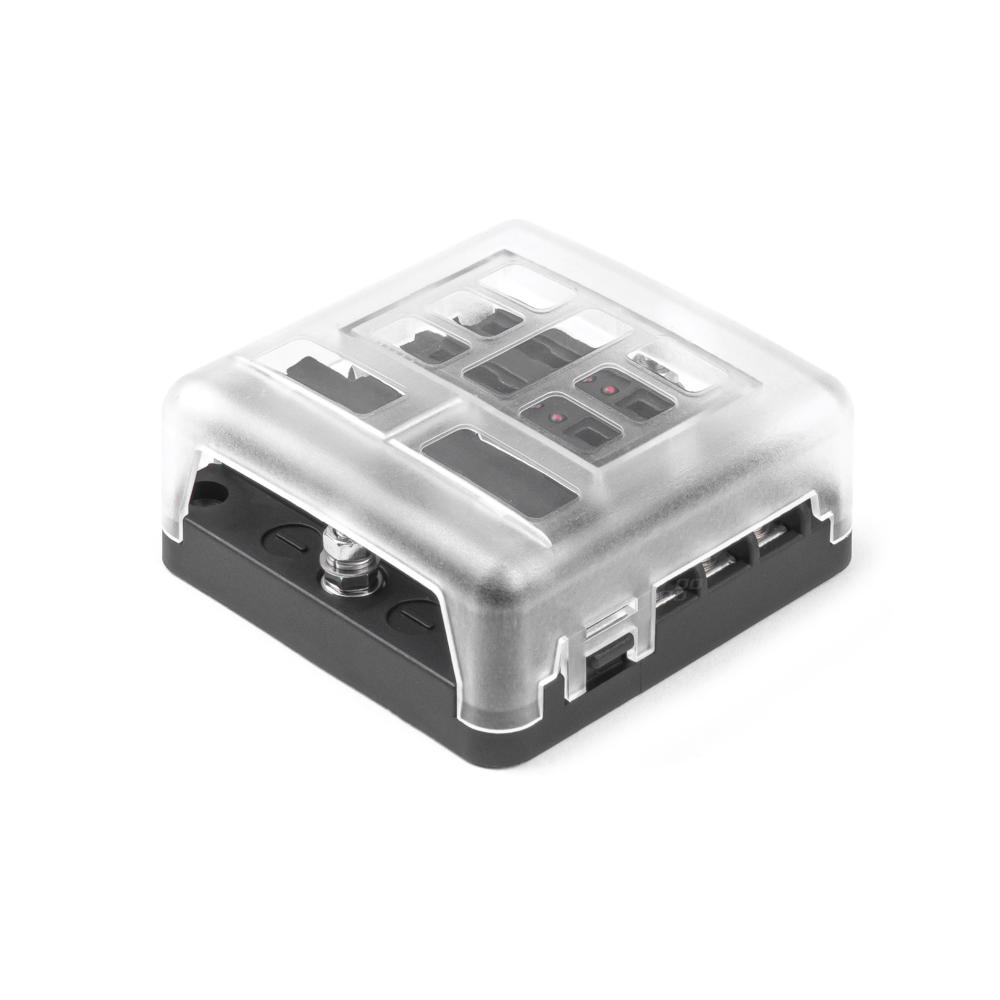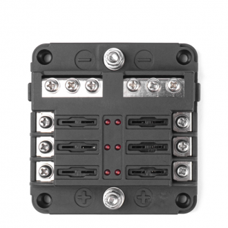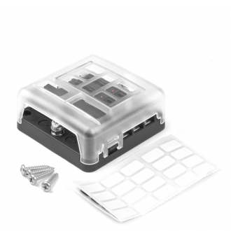 Univerzální 6okruhová pojistková skříňka. V případě přepálené pojistky se u každé zásuvky rozsvítí červená LED dioda, takže snadno a rychle zjistíte, který obvod je vadný.