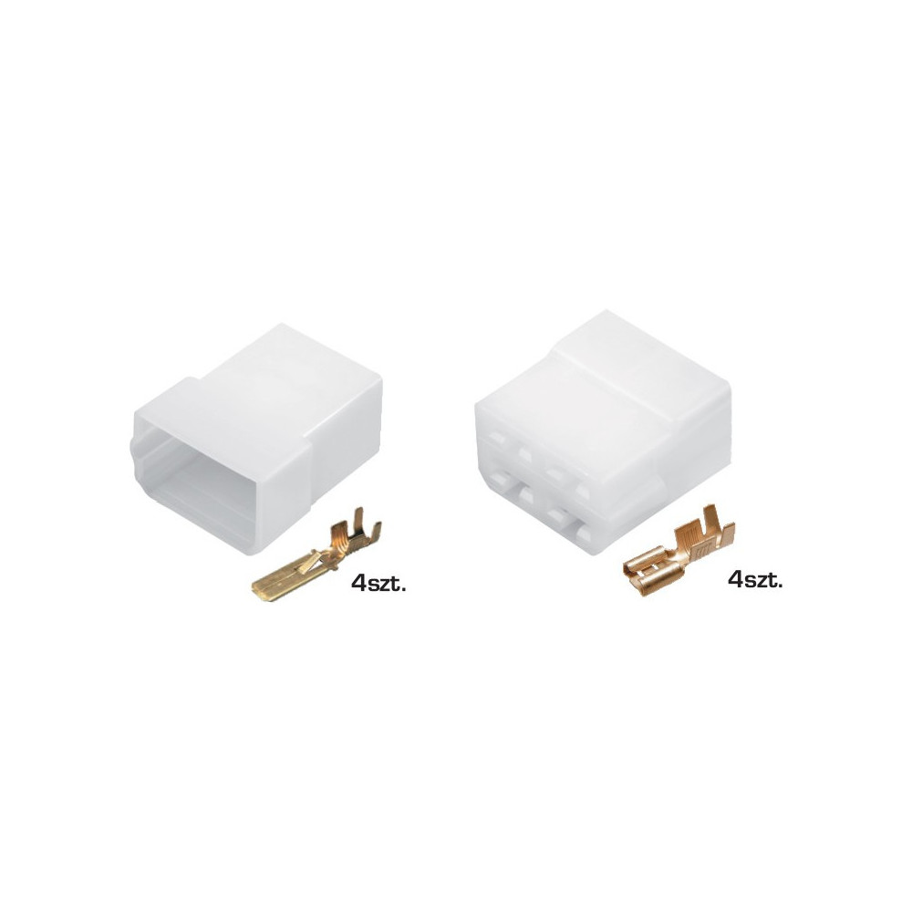 Vysoce kvalitní 4kolíkový (4vodičový) kabelový konektor určený pro spolehlivé elektrické propojení v automobilových a technických aplikacích. Konektor obsahuje zástrčku i zásuvku spolu s kovovými kontakty, což umožňuje pevné a stabilní zapojení vodičů.