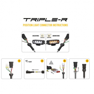 Triple-R 750 přichází s možností připojení integrované funkce obrysových/bočních světel , pro případ, kdy je požadavek na světelnou instalaci, která bude zaznamenána tolik během dne jako v noci. Existuje možnost připojit bílé nebo oranžové zbarvené obrysové světlo jednoduše vložením odpovídajícího drátu do konektoru pro lampu v místě instalace, nebo nechat obě odpojené, aby váš Triple-R 750 fungoval pouze jako dálkové světlo. Funkce dálkových světel je schválena podle předpisu ECE 112 , zatímco funkce obrysových světel (pouze bílá) je schválena podle předpisu ECE 7 , což umožňuje, aby vaše zařízení Triple-R 750 fungovalo paralelně s vašimi standardními světlomety (pokud jsou uznávány předpisy EHK OSN) . fických pro danou zemi a od toho, zda se světlo používá na nebo off-road.