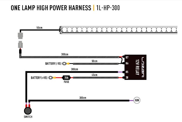 Elektroinstalační sada pro jedno světlo pro všechny vysoce výkonné LED reflektory Lazer bez certifikace E-mark (kromě Linear-48), kde je požadavkem ovládání světla pomocí nezávislého spínače umístěného uvnitř vozidla. Nastavení je rychlé, jednoduché aspolehlivé s německým konektorem a bez konfiguračních procedur. Sada obsahuje 12V relé (ve vodotěsném pouzdře), 35A pojistku, svorku baterie na jednom konci a 3m flex na kabelu lampy.