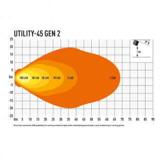 Utility-45 je vysoce výkonné pracovní světlo, které bylo v roce 2018 modernizováno, aby poskytovalo ještě větší viditelnost, s větší intenzitou a zlepšeným šířením světla, což usnadňuje bezpečnější a produktivnější pracovní prostředí. Čára 50 luxů, definovaná HSE jako efektivní úroveň osvětlení při práci venku v noci, je dosahována ve vzdálenosti 16 m, s rozpětím 10 m (namontována ve 3 ms 20 stupňovým úhlem). V kombinaci s konstrukčními funkcemi pro maximalizaci funkčnosti a spolehlivosti je to produkt, na který se lze spolehnout při poskytování výjimečného výkonu, čas od času, v jakékoli aplikaci.