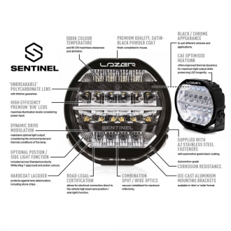 S rozšířením řady v roce 2022 nyní řada kulatých LED dálkových světel Sentinel zahrnuje 7palcové verze dostupné ve stupních Standard a Elite . Světla poskytují pozoruhodný výkon dálkového osvětlení a styl produktu, který vyzařuje kvalitu. Na úrovni Standard vyzařuje kombinace 12 vysoce výkonných LED diod 5 208 hrubých lumenů , zatímco na úrovni Elite 10 248 hrubých lumenů obslouží 24 vysoce výkonných LED diod , přičemž každý produkt má světelný výkon na silnici nebo trati před sebou maximalizován prostřednictvím přijetí špičkové elektroniky designu ve své třídě spolu s pouzdrem lampy optimalizovaným pro CAE.